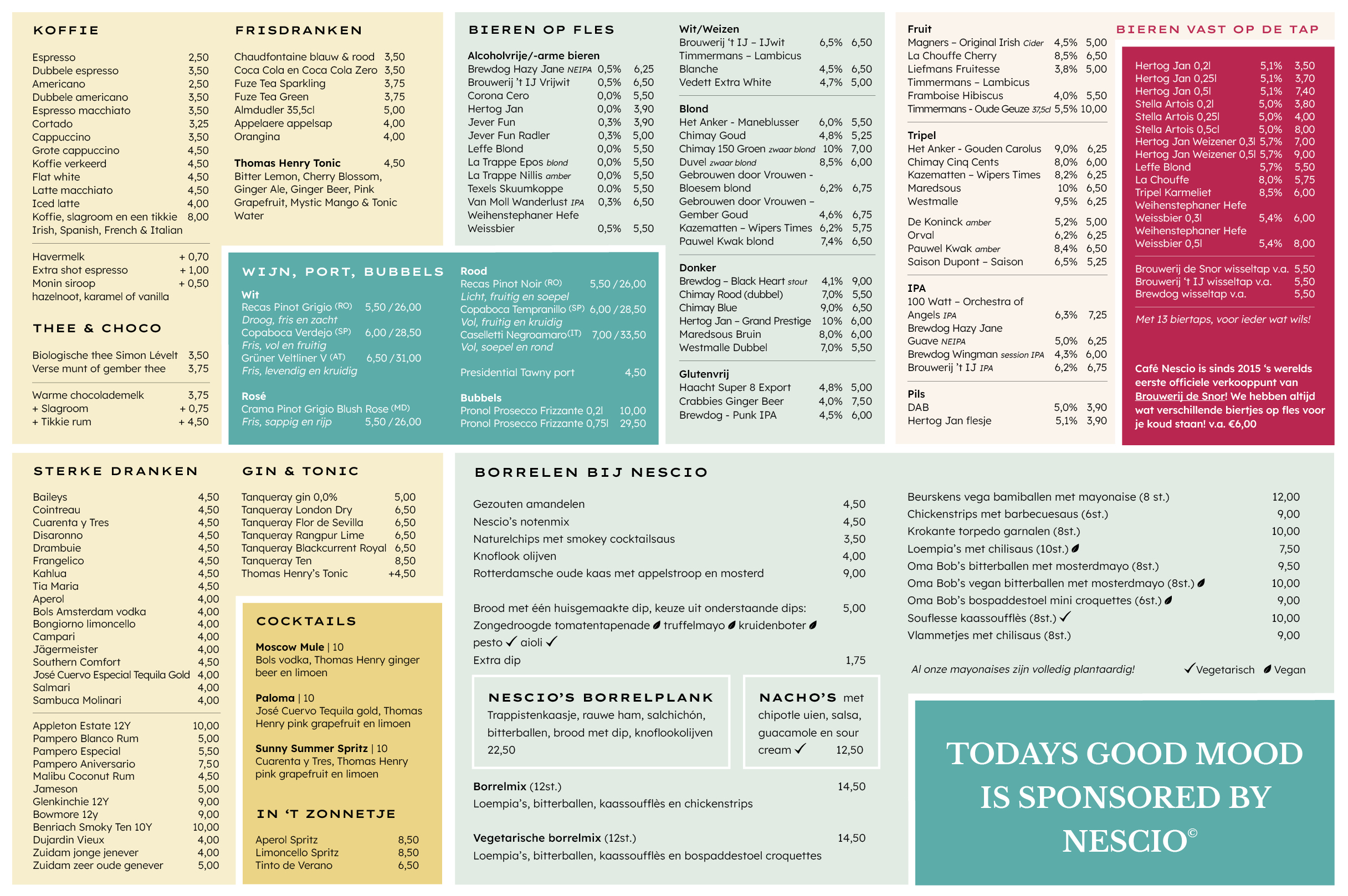 Met 13 tappunten en maar liefst 40 bieren op fles – bij Café Nescio vind je altijd wel een biertje dat bij je past. De kaart wordt met zorg samengesteld en uiteraard wordt er rekening gehouden met de seizoenen. Of je nu binnenkomt voor een snelle borrel of een avond lang wil genieten, bij Café Nescio zorgen we ervoor dat je altijd iets lekkers bij je drankje hebt.